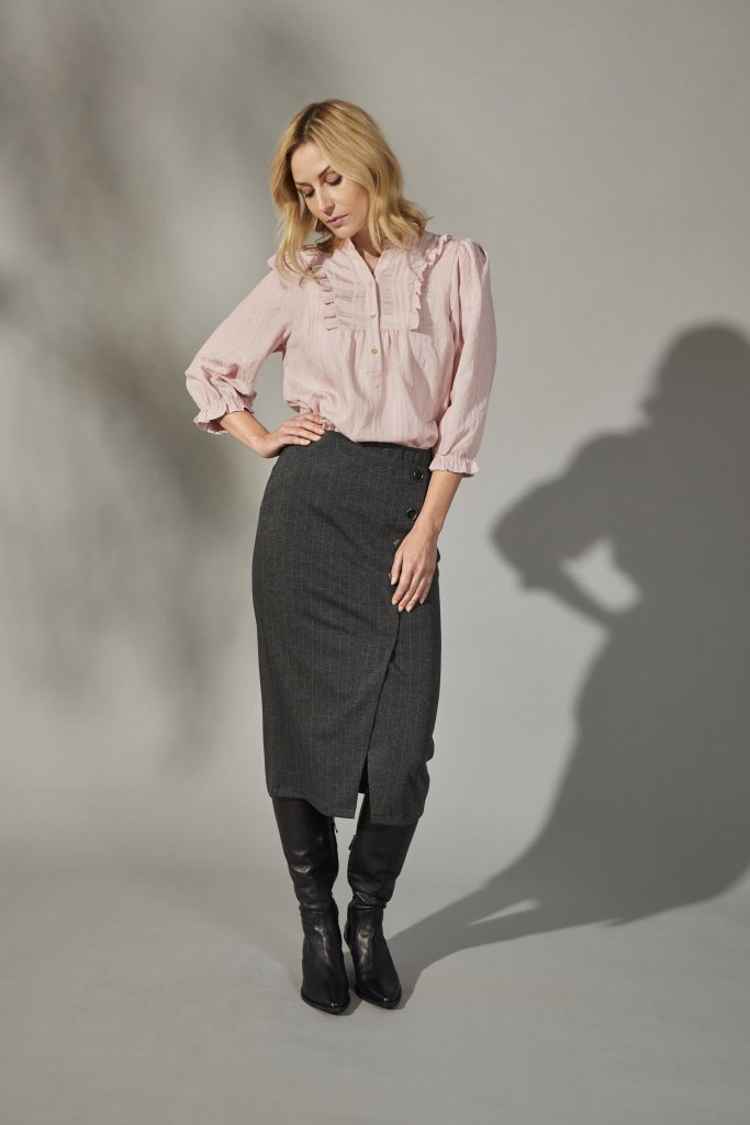 En stilig kjol från Brandtex. Resår i linning samt dragkedja i sidan för knäppning. Snedskuren framtill med knappar samt litet sprund fram. Passar utmärkt med tillhörande kavaj BR- 219227.