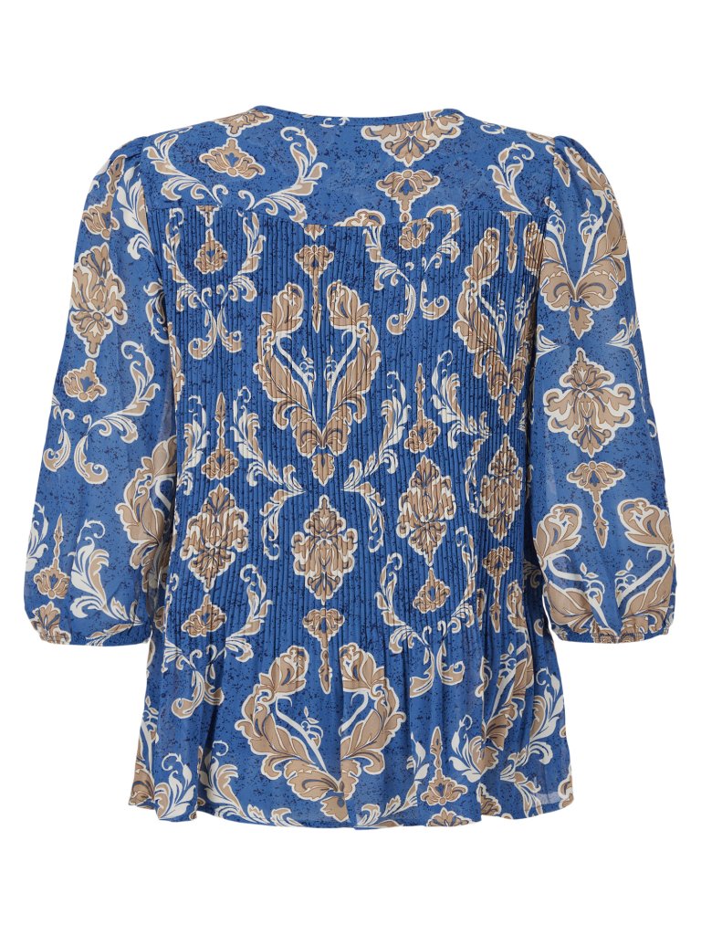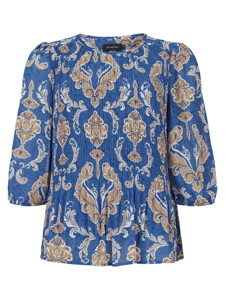 En snygg mönstrad blus från Brandtex. Rund hals och 3/4-dels ärm med resår i ärmslut. Blusen är i ett tunt plisserat tyg med fastsytt linne närmast kroppen.