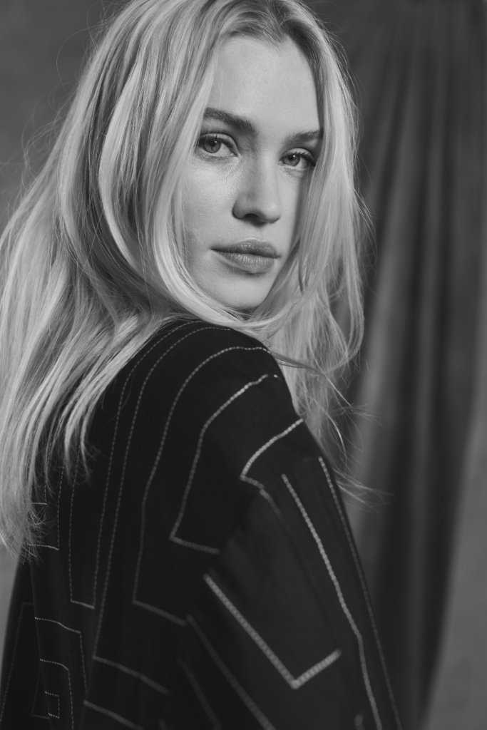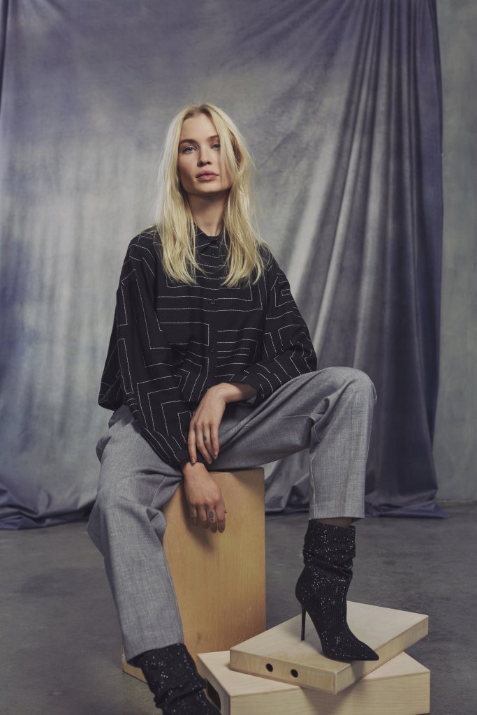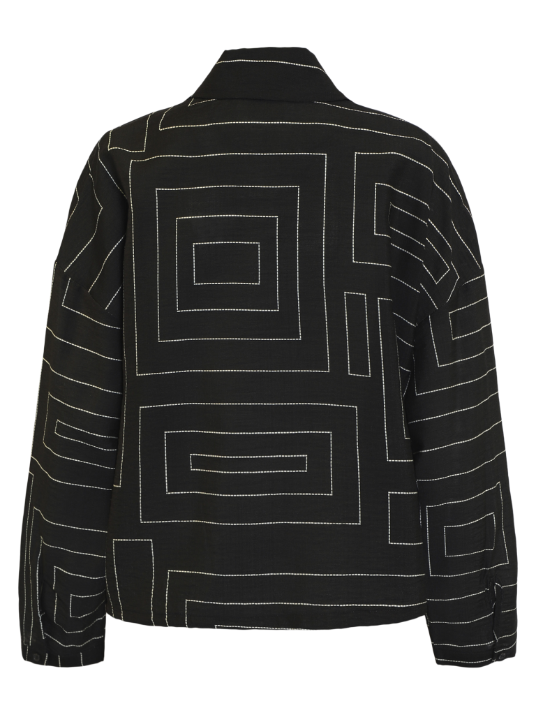 En tuff mönstrad blus i svart med sandfärgade streck från märket Brandtex Copenhagen. Blusen har krage och knappar framtill. Den är lite kortare i livet med band att justera nedtill. Vid lite kortare ärm med knapp i ärmslut.