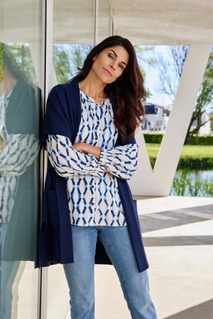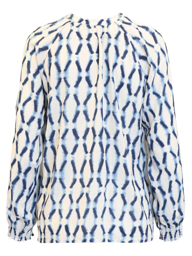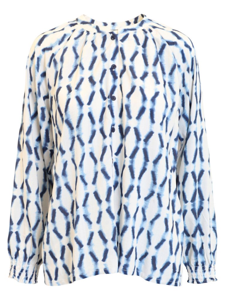 Snygg blus med rund hals och knappar fram från danska Signature. Blusen har en ljus botten med blå mönster. Ärmsluten har en liten mudd, så du kan välja om du vill ha ärmarna uppe eller nere.