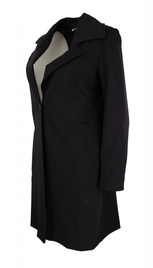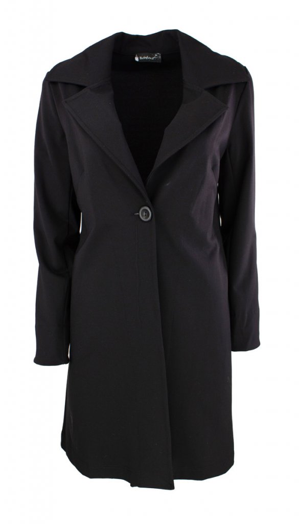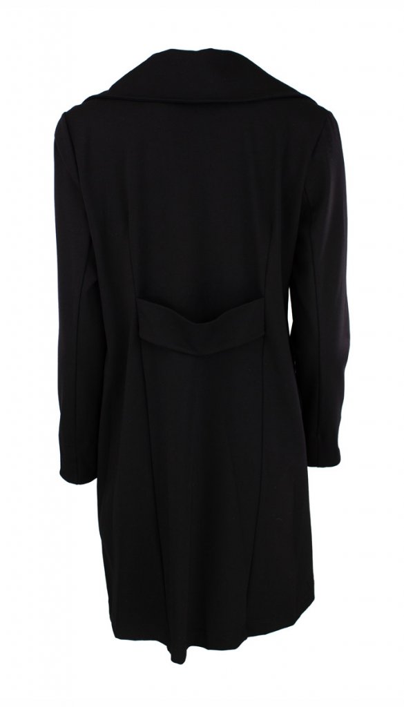En stilig användbar jacka i svart från märket Bohéme. Jackan har en snygg rejäl krage med slag. Knäpps med endast en knapp. Jackan är lätt figursydd och har en bra längd, slutar strax ovan knäet. Fickor och en snygg slå i ryggen.