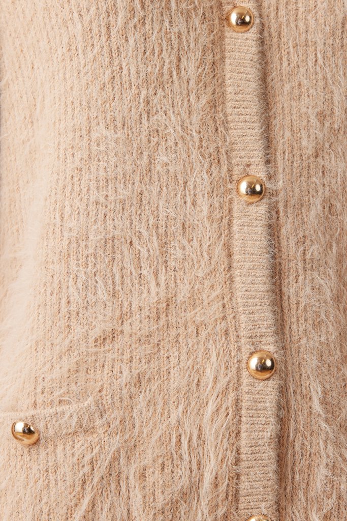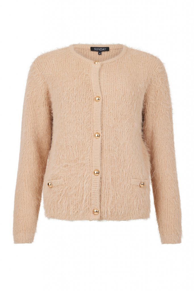 En mjuk och skön kofta från Sunday. Rund halsringning, snygga guldiga knappar och låtsas fickor. Passar utmärkt till byxa.