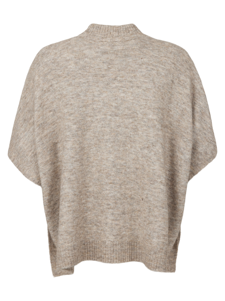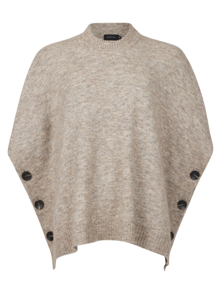 En varm och gosig Poncho från Brandtex. Rund snyggt ribbstickad halsringning även ribbstickad nedtill. Knappar i sidorna. Den fina tröjan under ponchon på bild 3 BR-219423.