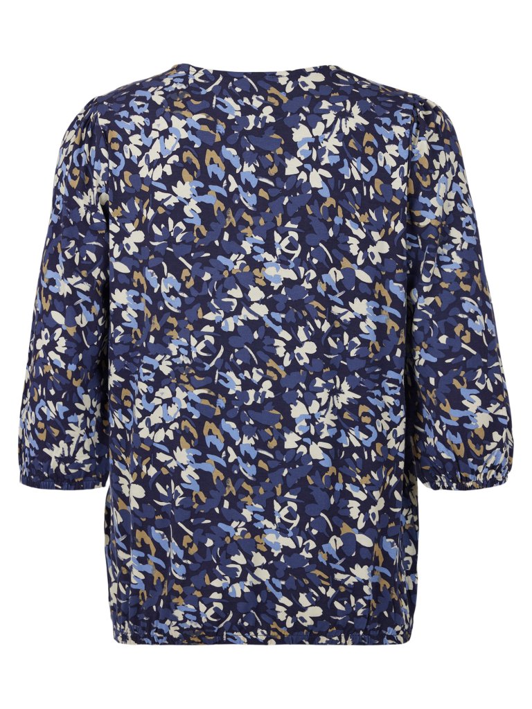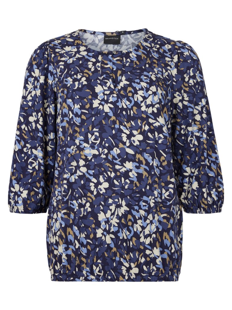 En härlig mönstrad topp från Brandtex. Rund hals med litet omlott sprund och knapp. 3/4-dels ärm med resår i ärmslut samt nedtill.