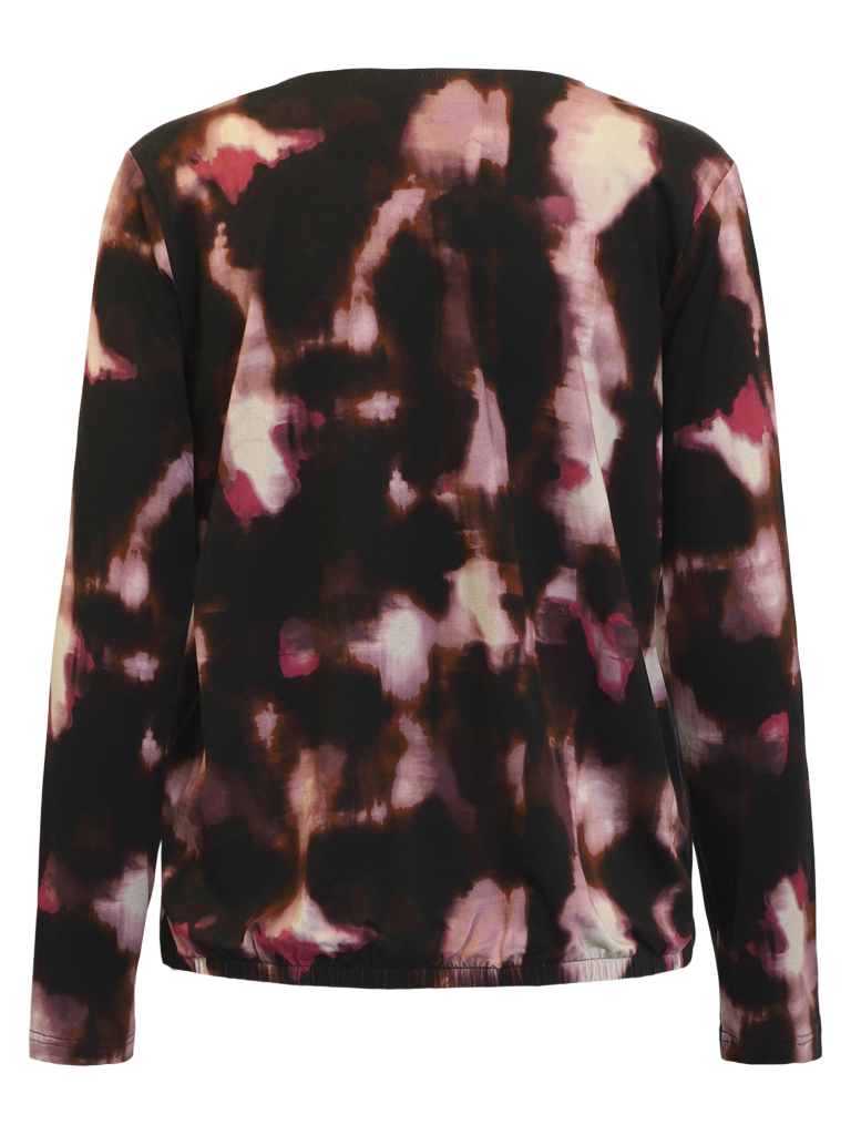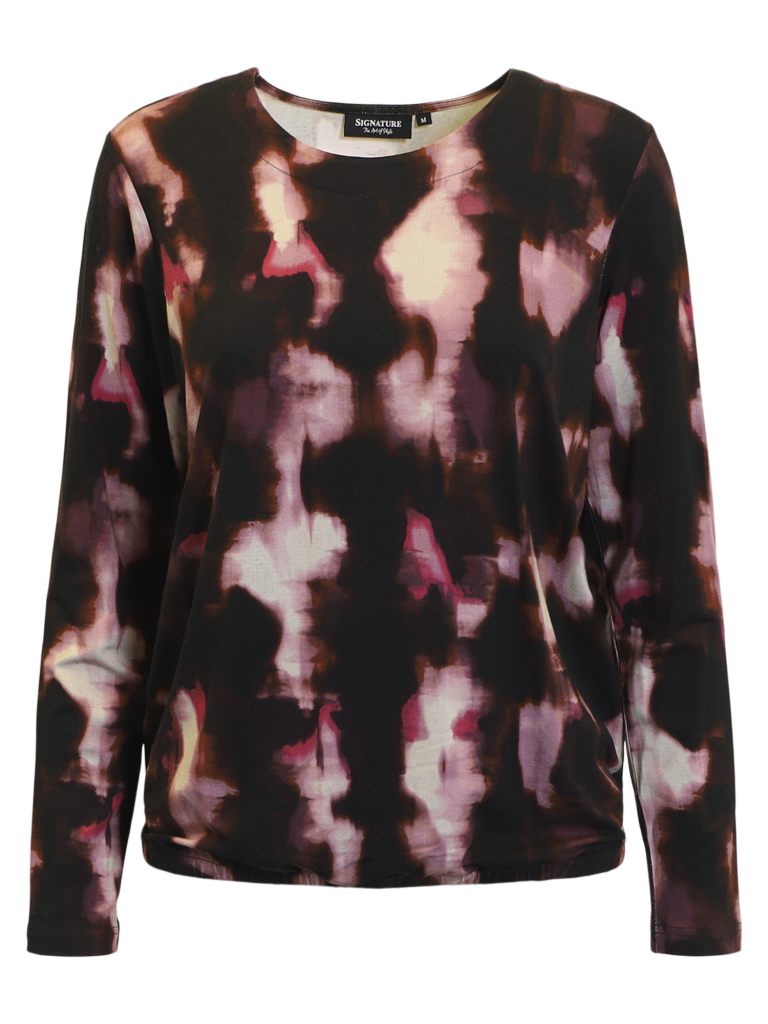 En skön mönstrad viskos topp från märket Signature. Rund hals, fullängd ärm samt resår nedtill. Passar utmärkt till svarta jeans.